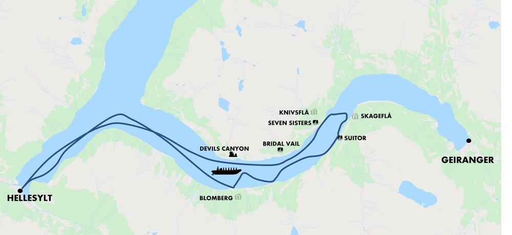 Hellesylt - Djevel Gjølet - Brude sløret - De Syv Søstre - Knivsflå - Skageflå - Friaren - Blomberg - Hellesylt