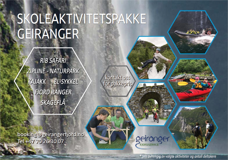 Hos Geirangerfjordservice får dere komplette pakker for en fantastisk klassetur i Geiranger. Dere får aktiviteter med masse action, adrenalin og spenning. Nye utfordringer gir læring og mestring på en helt annen måte enn i klasserommet og utvikler godt samarbeid mellom elevene.