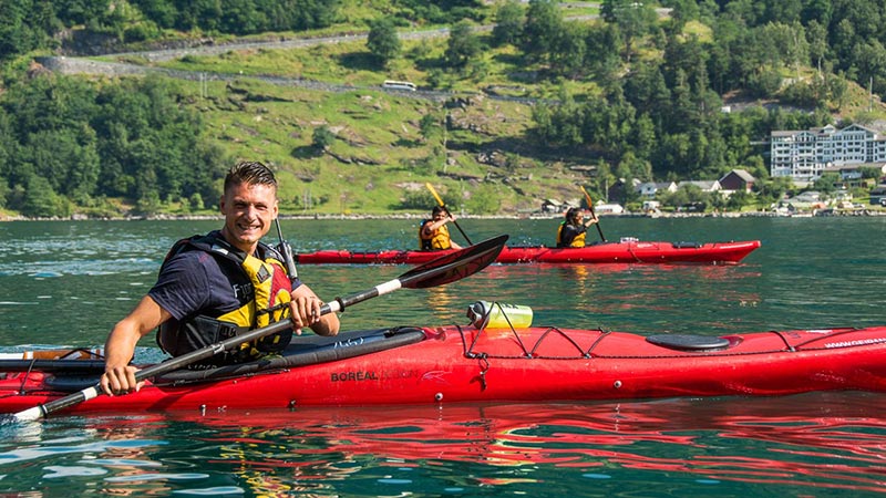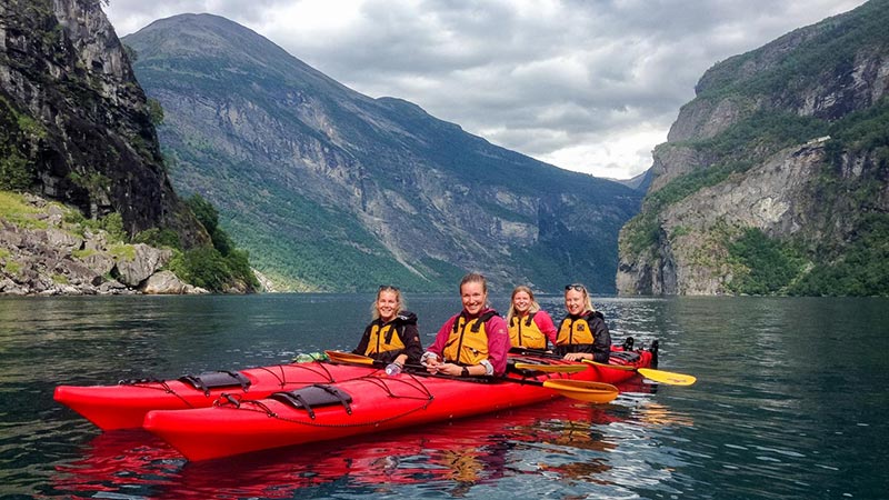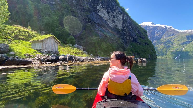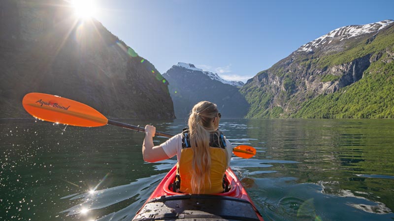 Vi starter ved kajakksenteret i Homlong og padler nedover fjorden til vi kan se det velkjente fossefallet De syv søstre. Her får du en fantastisk utsikt mot Dalsnibba og de majestetiske fjellene som ruver høyt over Geiranger. Videre padler vi ut og forbi Ørnevegen. Underveis vil guiden dele historier om hvordan det var å bo i en liten bygd innerst i Geirangerfjorden, og hvordan landskapet har blitt formet gjennom hundrevis av år.