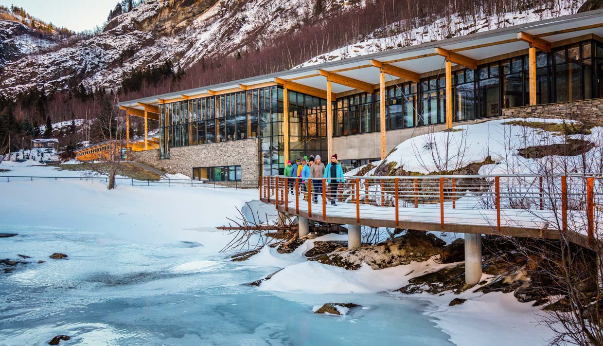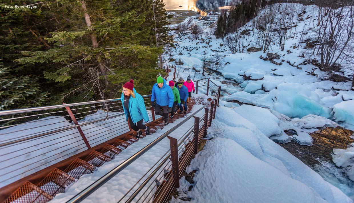 Velg deretter å gå «Fossevandringen» (327 trappetrinn) nedover den fantastiske elven fra Norsk Fjordsenter tilbake til skipet, eller ta bussen – det er opp til deg.