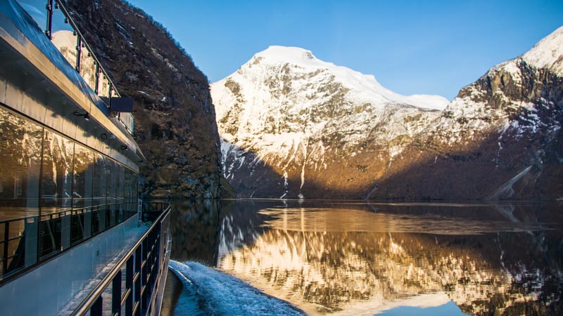 En naturskjønn vinterseilas gjennom dramatiske fjordlandskap som utfolder seg. • Busstur til Flydalsjuvet