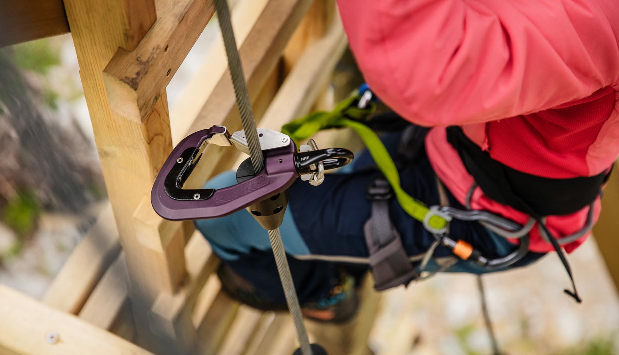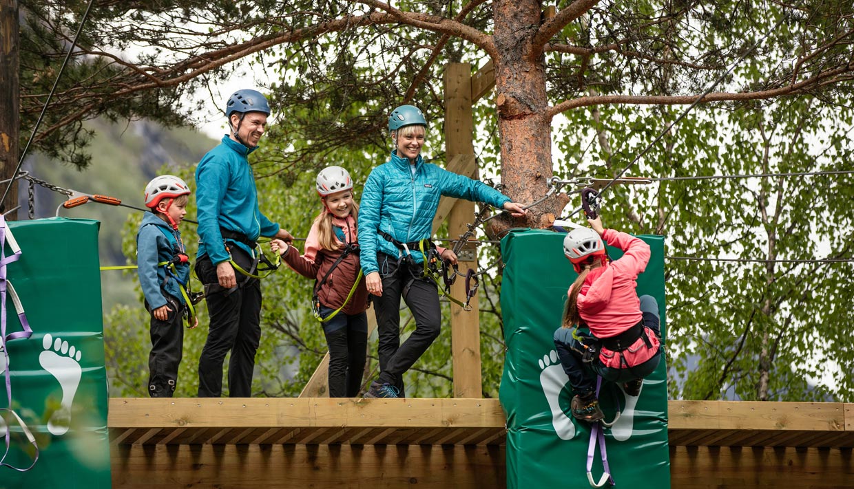 Våre zipliner er landets første zip der to wire går parallellt via fem installasjoner. Her får du fly gjennom UNESCO naturen som en fugl i tretoppene og kanskje kjenne litt på magesuget i det du flyr over Dynamittfossen:) Men parken byr på mer en bare flyging! Vi har integrert via ferrata og nepalbroer langs Geirangerelva. Dette er trygg klatring der du får testet armer, ben og balanse. Helt sikkert en opplevelse du sent vil glemme:)