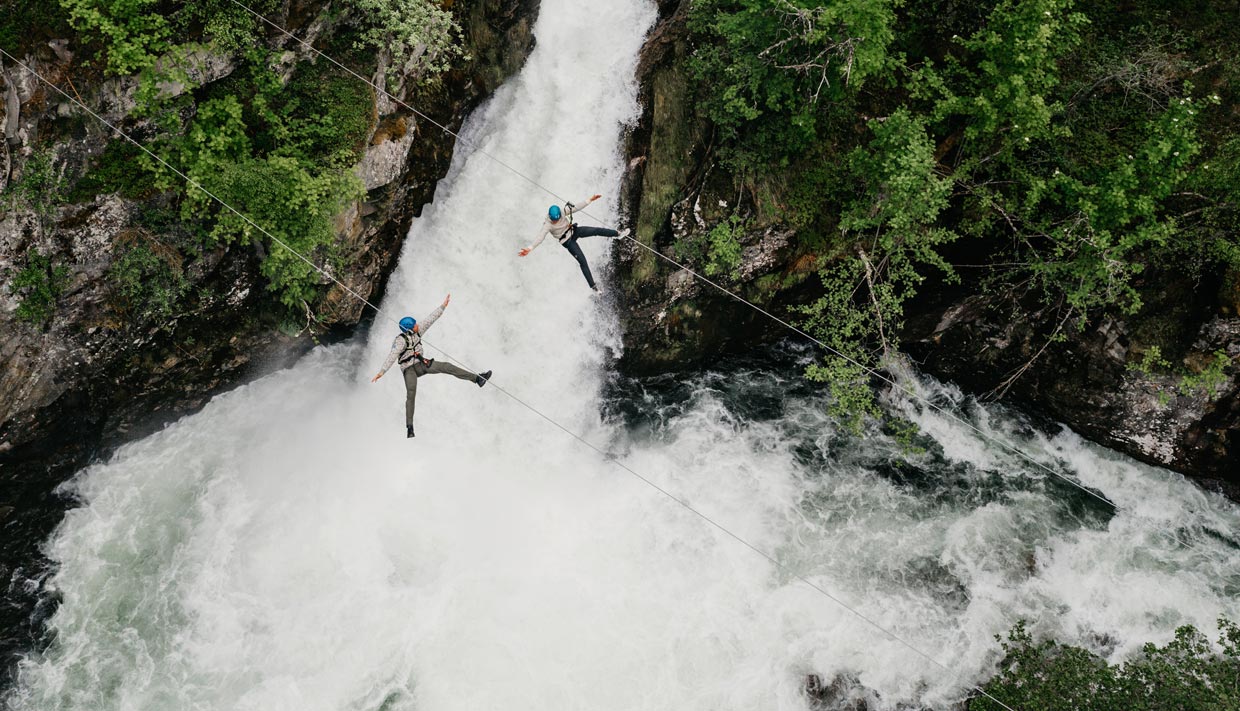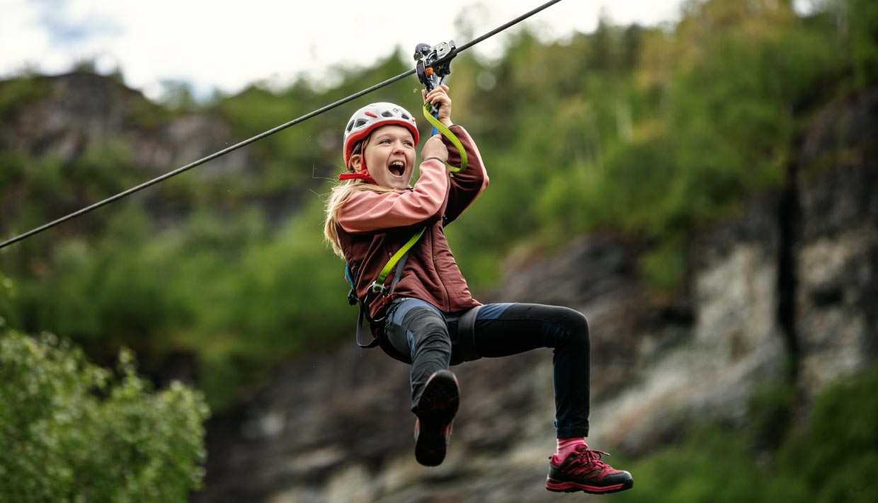 Ziplinene er bygd slik at det er både spennende og artig. Og kanskje vil du også kjenne litt på magesuget i det du krysser Dynamittfossen? Ziplinene gir en balanse mellom gåtur i skogen og spektakulær flyging. Alt sammen bygd inn i terrenget for å gi en tett og spennende naturoppleving. Vår zipline er den første i landet med dobbel wire over fem strekker. Den er perfekt for venner på tur eller familier.