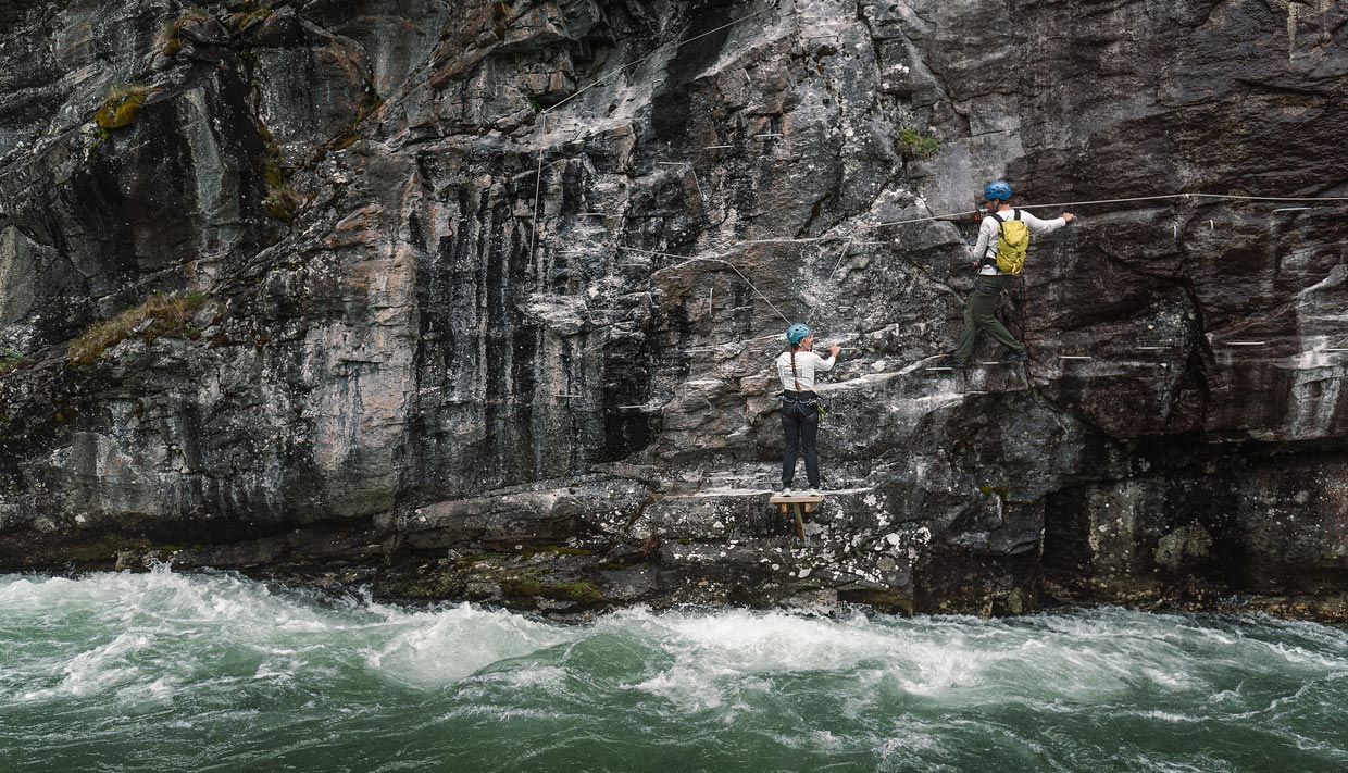Vi har bygd en spennende Via Ferrata i to deler. Den første delen traverserer langs Geirangerelva. Etter omtrent 50 meter møter du en 30 meter lang nepalbro som krysser elven til et tårn. Fra tårnet er der en ny nepalbro som fører tilbake til fjellveggen. Her er det to valg; gå til høyre om du ønsker litt enklere klatring. Gå til venstre om du ønsker en luftig og litt mer utfordrende klatretur.
